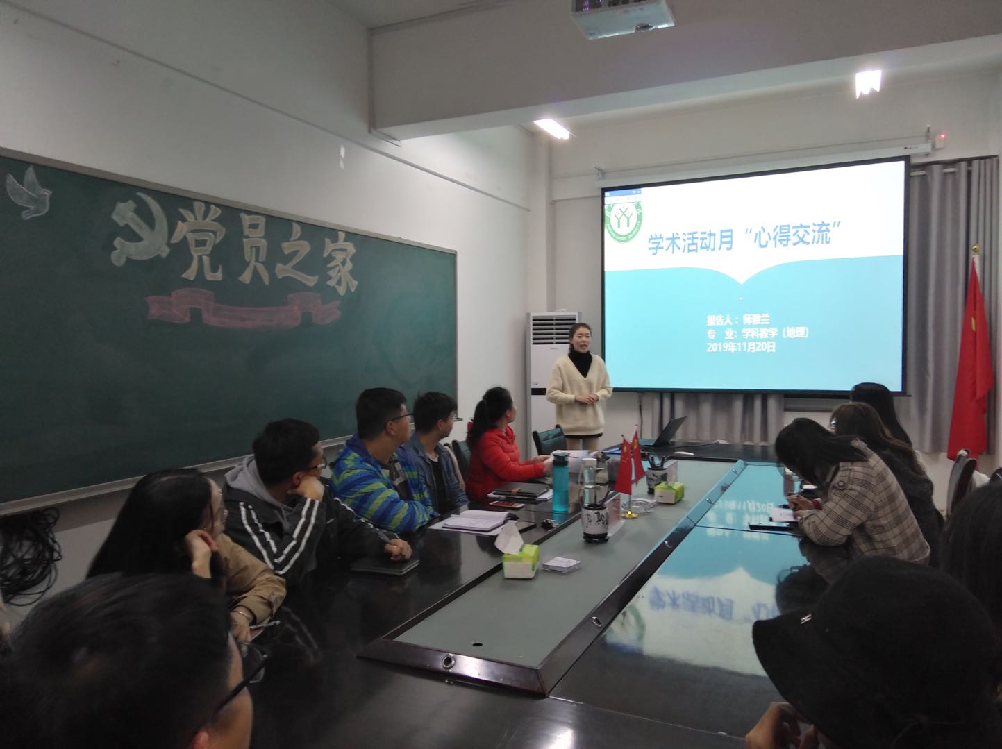 2019年11月20日,yL23411永利官网登录于理科楼南楼403室召开2019年硕士研究生国家奖学金经验交流会议。交流会由国家奖学金获得者、2018级学科教学·地理专业师雅兰主讲,yL23411永利官网登录全体在校研究生参加了此次交流会,会议由分会主席崔越主持。