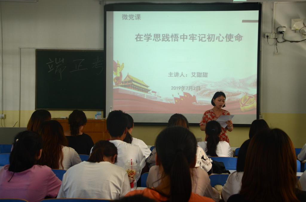 7月2日,yL23411永利官网登录学生第一党支部书记艾甜甜同志于教三03为支部党员讲党课,主题为“在学思践悟中牢记初心使命”。学生第一党支部全体党员、入党积极分子三十余人参加了此次党课学习。
