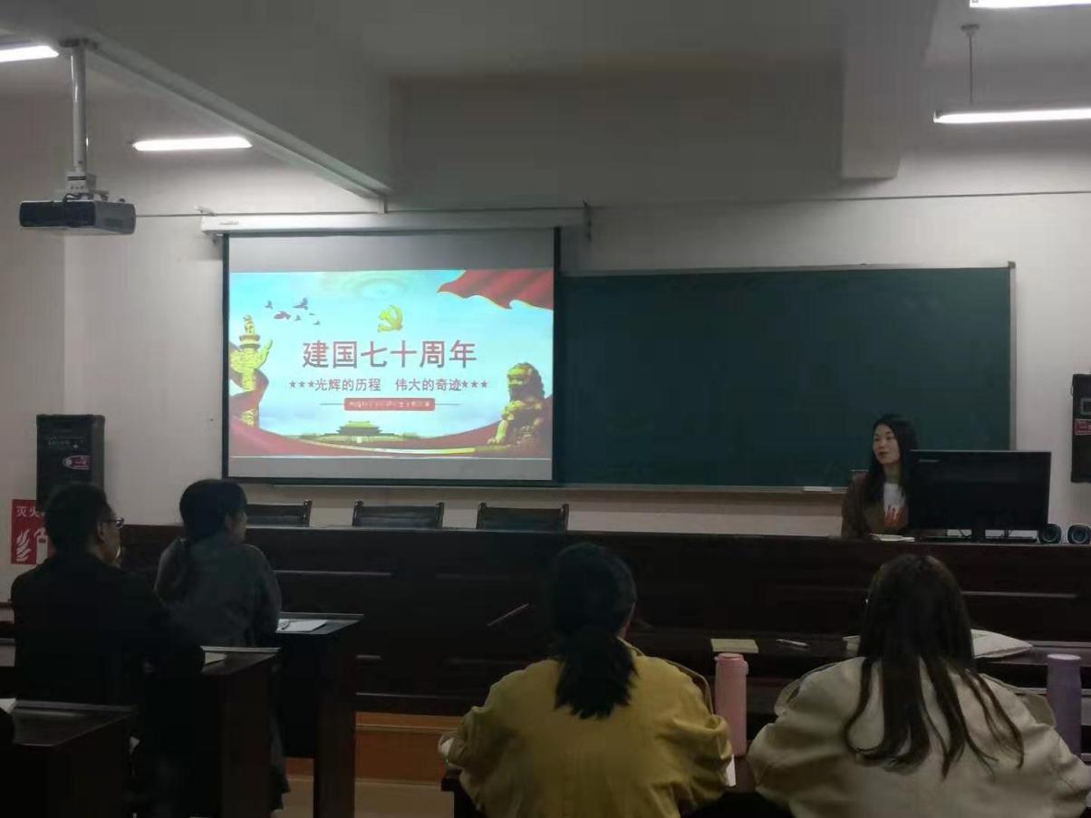 学习主要由支部书记翟慧敏同志进行专题讲解,翟慧敏书记从我们国家在过去的70年里由落后挨打的窘境到现如今走向伟大复兴里揭示了在过去的70年里中国发生的翻天覆地的巨变;接着,给我们讲述了中国在过去70年里的光辉历程,从经济发展、民生改善、科技进步、制度创新等方面介绍了中国自成立以来创造的伟大奇迹;最后,从支部书记从中国70年来的历程中总结了中国能创造如此伟业的原因:只有坚持中国共产党的领导,坚持马克思主义与中国具体实际相结合才能真正实现中华民族的伟大复兴。