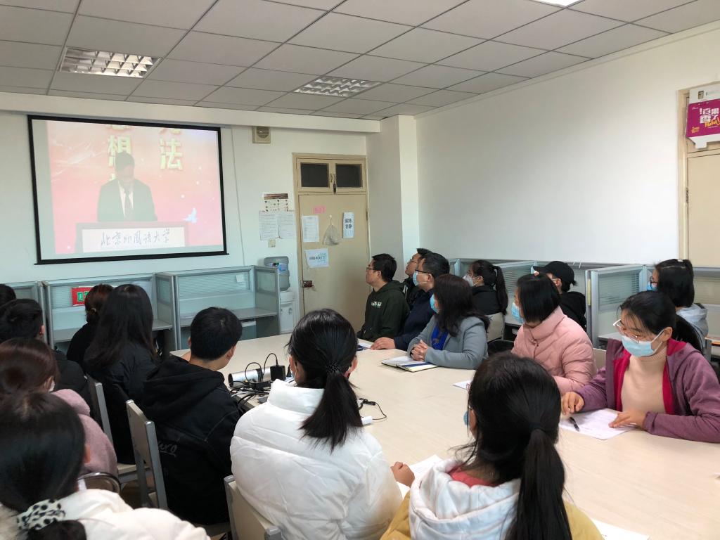 12月3日,yL23411永利官网登录于理科楼北1102顺利开展第八届国家宪法日“宪法晨读”活动,学院党委书记宋力、副书记朱明带领全体辅导员班主任及部分学生代表观看教育部全国青少年普法网直播,教育部领导领读宪法部分条款,现场全体人员精神饱满、同步跟读。学生纷纷表示,要继续学习宪法知识,弘扬宪法精神,维护宪法权威,让“每一天都是宪法日”。