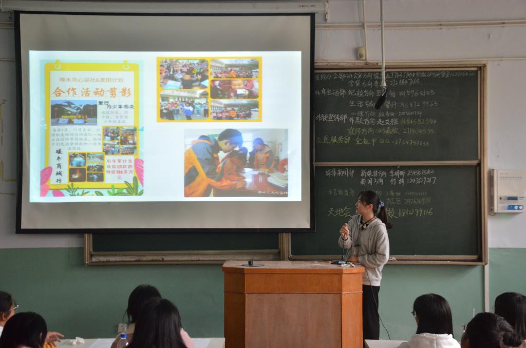 此次活动计划周全、有序开展,组织办公部、纪律生活部、媒体新闻部等六个学生会部门及天文地理爱好者协会、啄木鸟心益社、VOV背包文学社三个社团的负责人根据精心准备的PPT及相关视频向参会人员展开介绍。他们依次上台从部门简介、工作内容、人员要求等方面向新生详细介绍了该部门的具体招新情况。他们一致向同学们强调学生会是一个提升自我综合素质的平台,要敢于挑战,并欢迎在座人员加入学生会这个温暖而团结的大家庭。最后,由主席团成员向2020级新生发放申请表,并鼓励2020级新生要根据自我能力与特长积极报名参加。