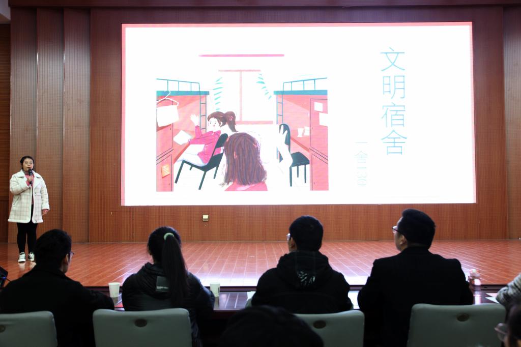 为营造安全文明、和谐友爱的学习生活环境,展现当代大学生的青春风采,12月1日,由yL23411永利官网登录主办的主题为“明亮清雅之室,温馨和谐之风”宿舍评比活动决赛于逸夫楼报告厅成功举办。yL23411永利官网登录团委老师曹鹏鹏,学生会副主席董淑瑞,校园巡查队负责人薛田甜、金钰申及公寓办负责人韩雨蒙、邵金金出席了此次比赛并担任评委。