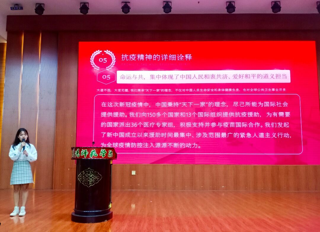 活动伊始,参赛选手们紧扣“学习四史、抗疫精神、脱贫攻坚、建党百年”四个主题进行演讲。选手们依次上台讲述所见所闻或亲身经历的感人事迹,并从不同角度形象生动地诠释了抗“疫”精神和脱贫攻坚精神。其中,王梦妍通过对抗“疫”历程的回顾,讲述抗“疫”故事,鼓励同学们发扬抗“疫”精神、致敬抗“疫”伟人。演讲比赛中穿插的抽奖环节趣味横生,活跃了现场气氛,增强了比赛的互动性。最后,活动进入隆重的颁奖环节,我院团委老师曹鹏鹏、学生会主席刘翌晨等人为“四史”系列活动获奖人员进行统一颁奖。