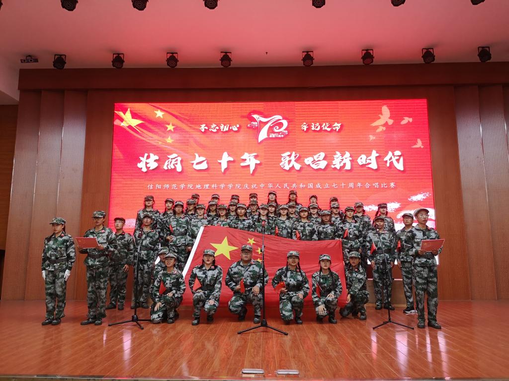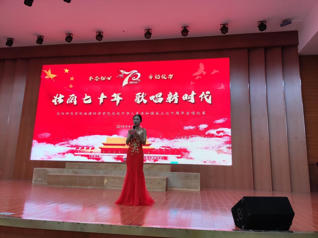 主持人简单介绍比赛规则和注意事项后,比赛正式开始,由七个新生班级组成的七支参赛队伍依次上台演唱。地理科学二班以一首《今天是你的生日,我的祖国》完美开场,用舒缓和畅的歌声表达了对祖国最真诚的祝愿。地理科学一班的《红旗飘飘》,气势恢宏,高亢激昂,点燃整个比赛现场。随后,各班逐一上台为观众献上《我的中国心》、《没有共产党就没有新中国》、《保卫黄河》、《大中国》、《爱我中华》等曲目。期间,2018级测绘工程班学生张世可以一首独唱《中国人》歌颂祖国的繁荣富强,抒发自己对祖国的热爱与祝福。本次比赛共演唱七首合唱曲目,新生们用歌声表达祝愿、用歌声追忆历史,歌颂民族希望、祖国未来,充分彰显了新时代大学生意气风发、朝气蓬勃的精神面貌,赢得了在场观众的阵阵掌声,最终评选出一等奖1名、二等奖2名、三等奖4名。最后,比赛在全体师生的一首合唱歌曲《歌唱祖国》中落下帷幕。