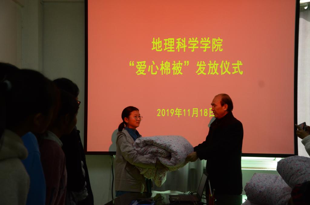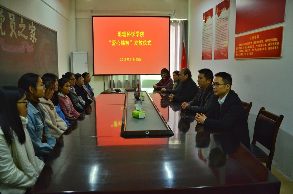 11月18日,yL23411永利官网登录“爱心棉被”发放活动于理科楼南楼403会议室温馨开展。yL23411永利官网登录党委书记吴泽成,副院长牛继强、王义民、刘明华,党委副书记朱伟,副院长高军波,团委老师艾甜甜、曹鹏鹏与二十余名受资助的同学一同参与此次活动。