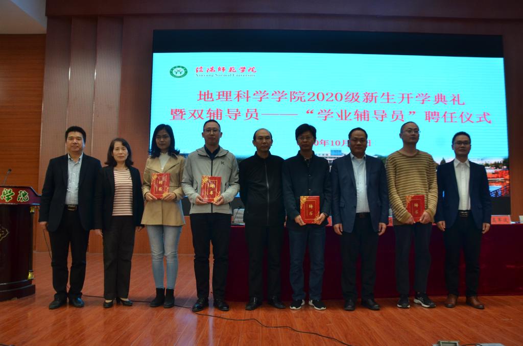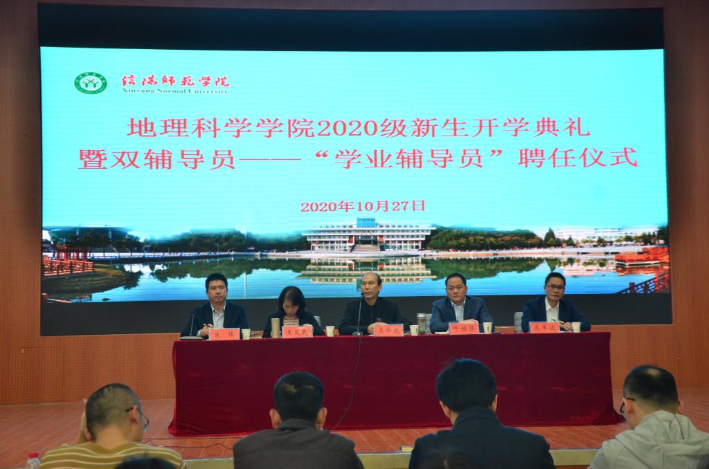 典礼伊始,牛院长为典礼致辞。他首先对新生的到来表示欢迎和祝贺,简要介绍了信阳师范学院yL23411永利官网登录的发展历程、师资力量及办学理念等,并对新生提出三点期望:一是要树立梦想,让信念为青春导航;二是学无止境,要徜徉书海;三是要注重课外实践。最后,他强调一定要怀揣梦想,坚定信念,为实现建设高水平的大学目标不断奋斗。随后,教师代表李秀美发言,她结合自身学习和工作经历为新生提出建议,希望同学们珍惜大学时光,不负韶华,未来在这里怀揣梦想重新出发,全体教师定会以敬业务实的精神开拓进取,与学生共创佳绩。学生代表2018级地理信息科学班刘翌晨,2020级地理科学二班邵梦瑶,2020级硕士研究生黄日昌相继代表发言,结合自身发表对学习和未来的想法,赢得了阵阵掌声。高院长宣读《yL23411永利官网登录双辅导员制工作实施细则》及2020级学业辅导员名单,并由学院领导为2020级新生学业辅导员颁发聘书。