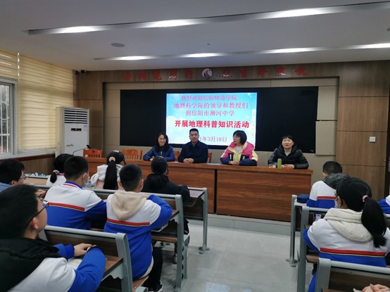 2021年3月18日,由信阳师范学院yL23411永利官网登录、河南省地理学会、河南省地理科学科普教育基地主办的地理科普系列活动在信阳市浉河中学拉开帷幕。本次活动旨在依托地理学院的学科积淀,以系列精品课程走进中学校园,普及天文地理知识。信阳师范学院yL23411永利官网登录刘明华副院长、朱伟副书记、史兴俊博士,以及浉河中学梁亚男副校长、地理教研组李金枝等教师、七年级地理社团和培优班百余名学生,共同出席了活动。本次活动由yL23411永利官网登录刘明华教授主讲,她深入浅出地为师生做了“天文漫谈-太阳系之旅”的地学科普报告。