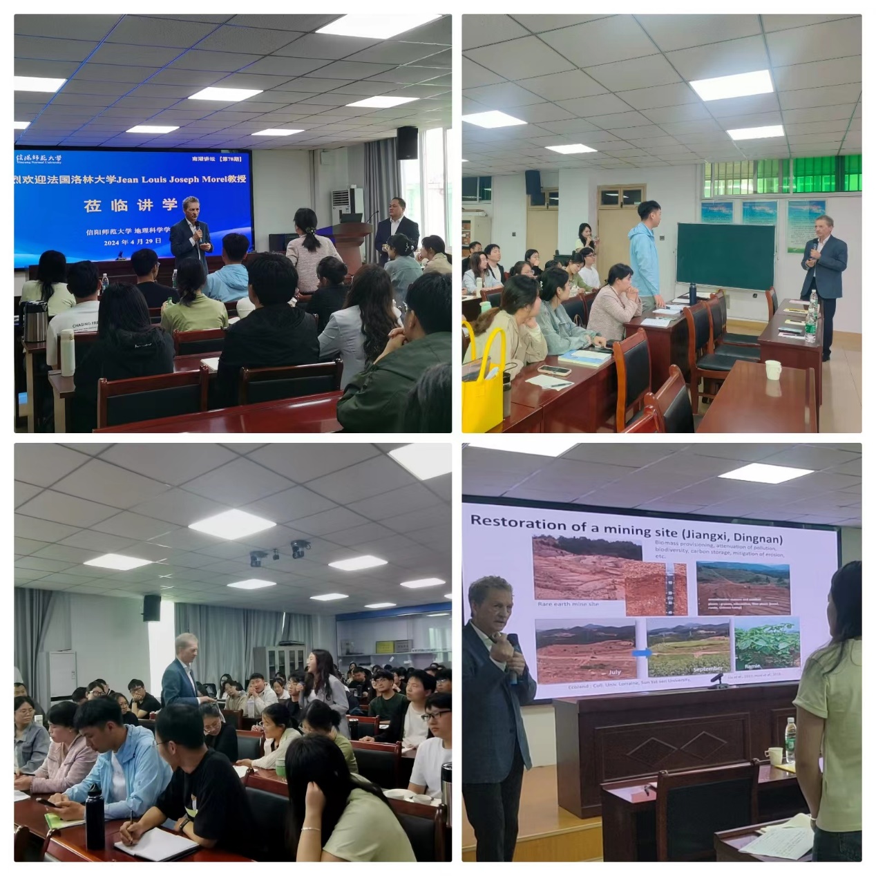 报告会上,Morel教授结合自身科研实践,在介绍SUITMAS多样性和常见特性的基础上,深入讲解了土壤修复的概念,探讨了Technosol的概念、演化过程及其功能特点,并分享了其在土壤重金属植物生态修复技术、植物采矿技术等生态环境修复和治理的相关研究成果。随后,Morel教授与在座师生分享了他的跨越南北大地的骑行之旅。Morel教授表示,此次造访信阳师范大学不仅为了探讨土壤污染修复领域的问题,也希望可以激发青年学生对于土壤污染修复的兴趣,并致力于相关研究,共同为土壤污染修复相关领域做出贡献。报告会最后,Morel教授热情耐心地回答了同学们的问题,现场互动频繁,气氛热烈。