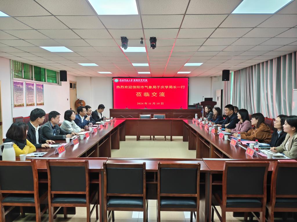 为推进信阳师范大学和信阳市气象局的深度战略合作,2024年11月15日上午,信阳市气象局党组书记、局长于庆学,副局长胡玉梅、赵辉,信阳市气象学会秘书长王梦旖、业务科副科长邱列君、杨慧洁以及科技服务中心主任曹雨和副主任杨雪一行8人莅临我院座谈交流。yL23411永利官网登录副院长颜俊、闫军辉、潘晓芳,科研与研究生工作秘书崔向超、教学秘书刘晓咏、地理信息科学系主任张兴国以及颜伟博士和刘昱君博士参与此次座谈,座谈会由闫军辉主持。